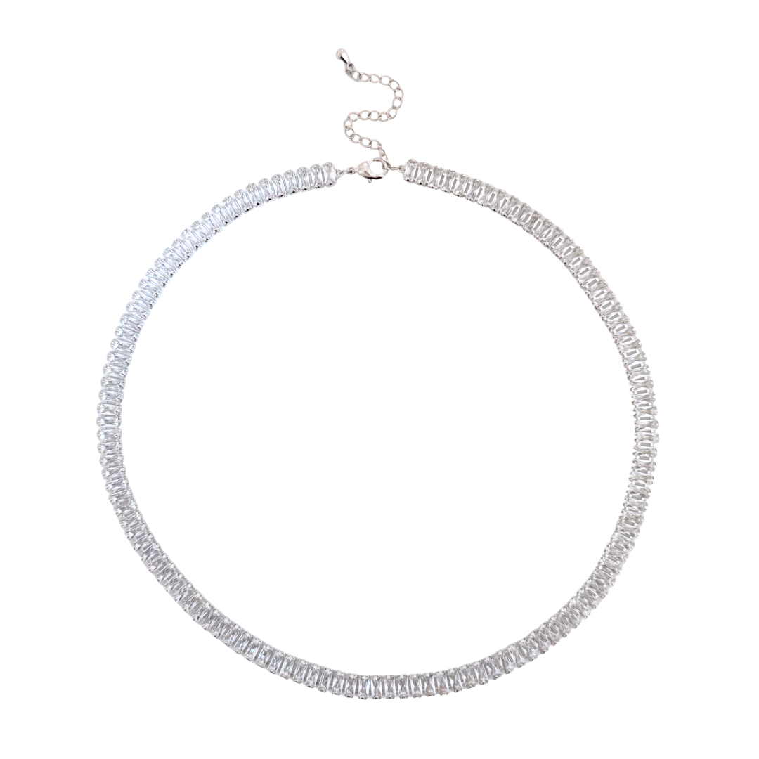 Elevate your look with this stunning tennis-style necklace featuring baguette-cut imitation diamonds set elegantly in a classic tennis design, secured with a reliable lobster clasp.