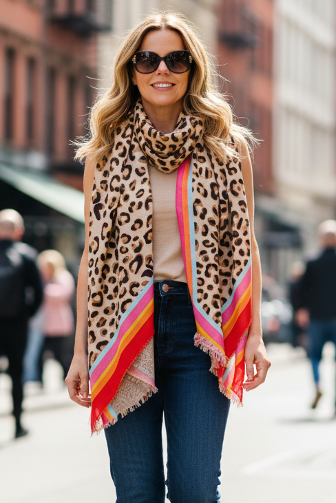 Leo Print Bright Border Scarf | Pink Mix